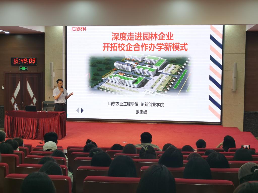 座谈结束后,张忠峰在图书馆学术报告厅为学校园林等专业相关师生作了一场题为《深度走进园林企业、开拓校企合作办学新模式》的学术报告。他依次介绍了个人的求学、创业、人才培养等经历,重点介绍了山东农业工程学院在校企合作方向的办学经验,报告结束后与师生进行了深入交流。