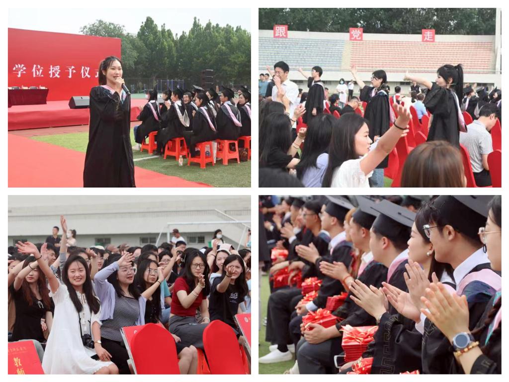 典礼现场气氛热烈。典礼开始前音乐学院学子带来歌曲快闪《凤凰花开的路口》,轻快悠扬的旋律带动起全场的心灵共鸣,燃起了现场一波又一波的欢呼与热潮;伴随着《歌唱祖国》的旋律响起,毕业生们齐声合唱,用最真诚最嘹亮的歌声唱出了对祖国的热爱和对美好未来的向往。典礼上,毕业生代表们还向教师、管理服务人员献上了满载感谢、敬意与祝福的花束。