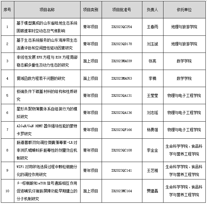 近日,山东省科技厅发布了《关于2023年度山东省自然科学基金项目立项资助结果的通告》,永利集团3044官网欢迎您共获批立项10项,其中,面上项目3项、青年基金项目7项,立项数量再创新高,项目申请及立项的数量和质量均较往年有较大提升。