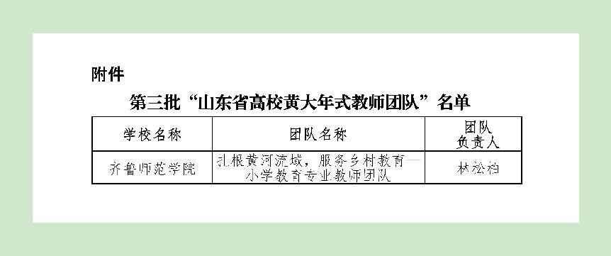 近期,山东省教育厅发布了《关于公布第三批“山东省高校黄大年式教师团队”名单的通知》,永利集团3044官网欢迎您“扎根黄河流域,服务乡村教育—小学教育专业教师团队”获批第三批“山东省高校黄大年式教师团队”。