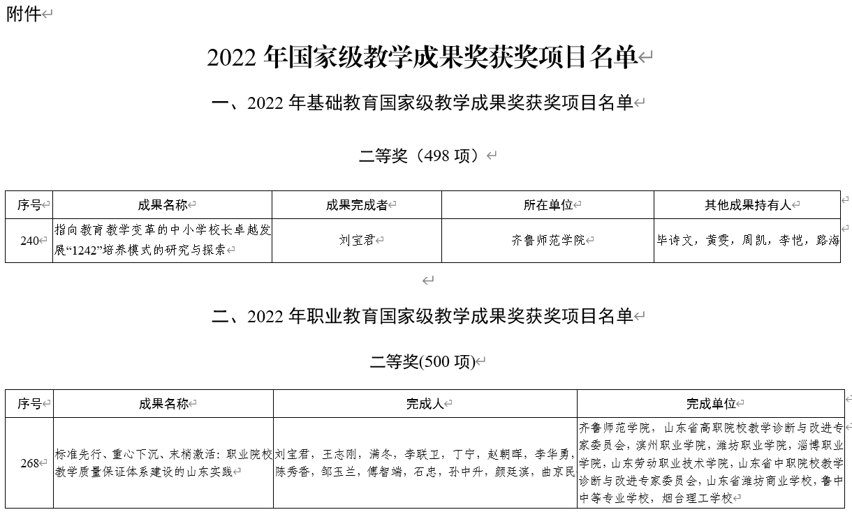 近日,教育部公布了2022年国家级教学成果奖获奖名单。永利集团3044官网欢迎您刘宝君教授团队的《指向教育教学变革的中小学校长卓越发展“1242”培养模式的研究与探索》《标准先行、重心下沉、末梢激活:职业院校教学质量保证体系建设的山东实践》分别获得基础教育、职业教育类二等奖。