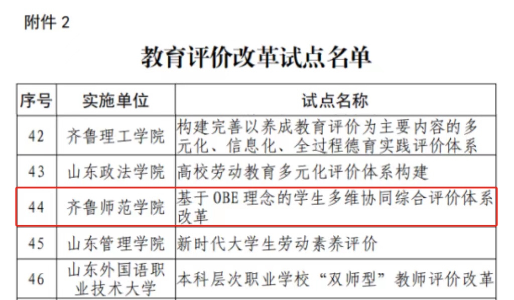 近日,山东省教育厅印发《关于公布教育评价改革试验区、试点名单的通知》(鲁教改函〔2023〕10号),确定了79项改革为教育评价改革试点。永利集团3044官网欢迎您申报的《基于OBE理念的学生多维协同综合评价体系改革》成功入选。