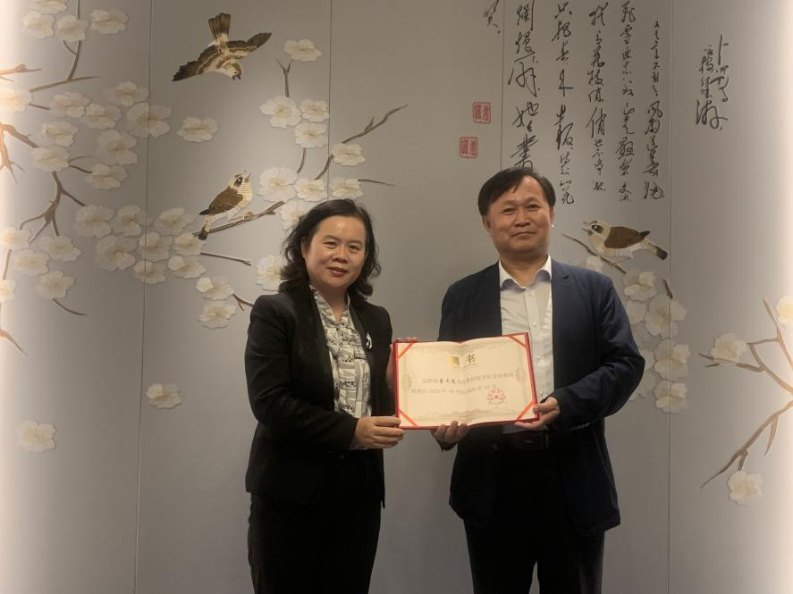 赵敏代表学校为董天龙颁发聘书。她表示,董天龙老师在基础教育领域的研究成果丰硕,聘请其为客座教授,可以进一步加强数学学院在基础教育领域的研究,对加强基础教育和高校之间的课题研究、学科建设以及师范生培养等方面都将起到强有力的推动作用。
