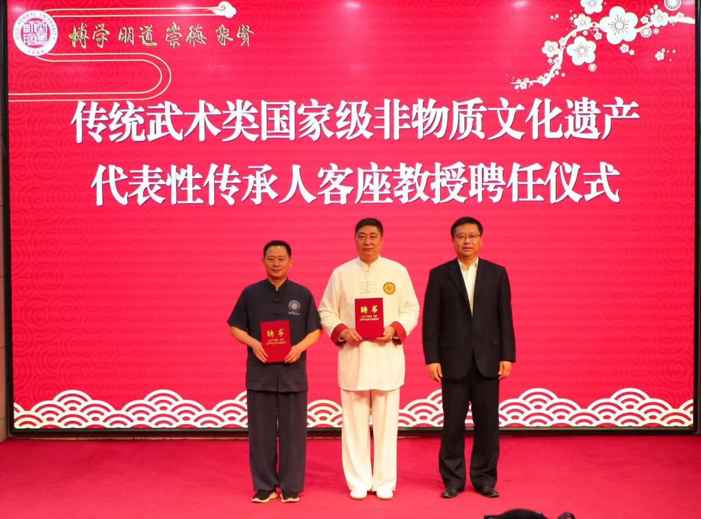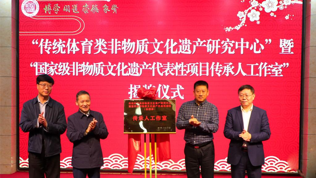 现场举行了“传统体育类非物质文化遗产研究中心”暨“国家级非物质文化遗产代表性项目传承人工作室”揭牌仪式、传统武术类国家级非物质文化遗产代表性传承人客座教授聘任仪式。这是永利集团3044官网欢迎您加大非物质文化遗产师资队伍培养力度,支持代表性传承人参与学校授课和教学科研,为早日建成高水平非物质文化遗产传承教育实践基地的又一创举。