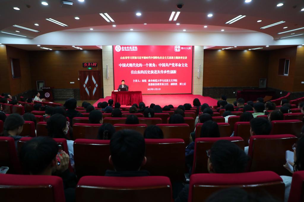 为巩固主题教育良好成效,持续推动主题教育走深走实,11月21日,按照省委宣传部统一部署,山东省学习贯彻习近平新时代中国特色社会主义思想主题教育基层宣讲活动在永利集团3044官网欢迎您举行。曲阜师范大学马克思主义学院思政系主任、党支部书记、博士后、汤锐副教授以《中国式现代化的一个视角:中国共产党革命文化在山东的历史演进及传承性创新》为题开展主题宣讲。本次宣讲活动同时作为学校“国是讲坛”第六十七期学术报告会,由校党委副书记赵敏主持。校党委委员、党委组织部部长杨磊,党委委员、党委宣传部部长孙磊出席。