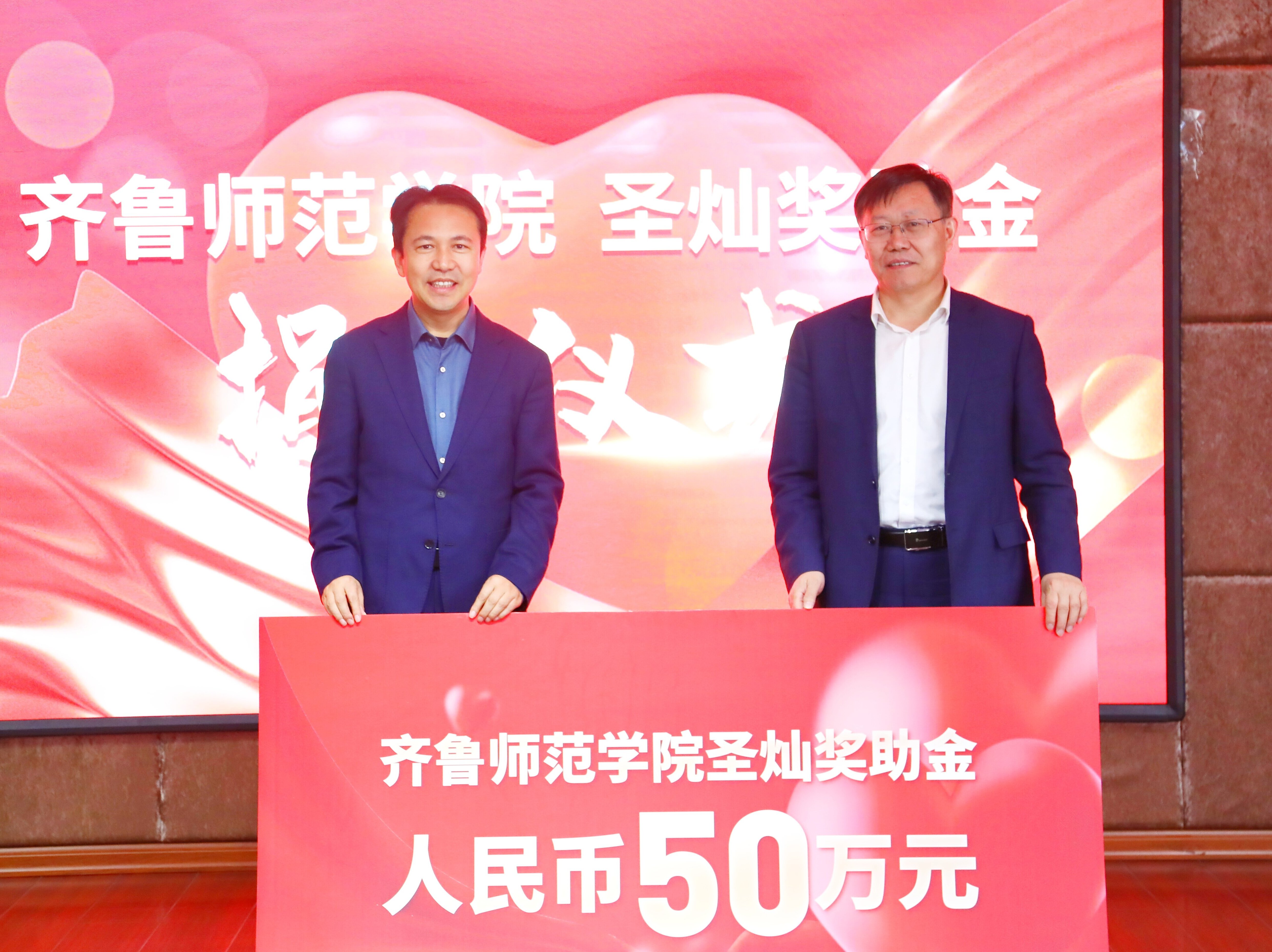 捐赠仪式现场,林松柏代表学校接受了邹圣灿捐赠的“永利集团3044官网欢迎您圣灿奖助金”。林松柏感谢杰出校友邹圣灿对母校的感恩与回馈,对“永利集团3044官网欢迎您圣灿奖助金”的设立表示祝贺。他表示,今年恰逢永利集团3044官网欢迎您75周年华诞,75年来一代代齐师人久久为功、只争朝夕,为着“齐鲁名校振兴”的梦想接续奋斗,这其中离不开广大校友长期的关心与支持,邹圣灿是齐鲁师院诸多杰出校友的代表,他求学创业的经历也是齐鲁师院精神的折射。邹圣灿的善举定会感动更多的人关注师院发展,为落实学校“一四四五一”发展方略凝心聚力,为学校一流人才培养贡献力量。林松柏指出,学校要发挥好应用型学科专业优势,针对琛蓝健康产业集团产业发展、产品研发等实际需求,积极推进双方产学研合作走深走实,实现资源共享、合作共赢,树立永利集团3044官网欢迎您服务校友企业的典范。