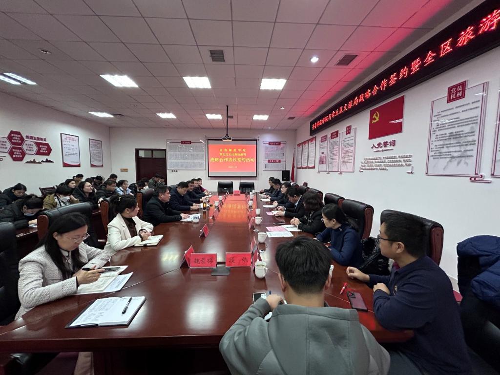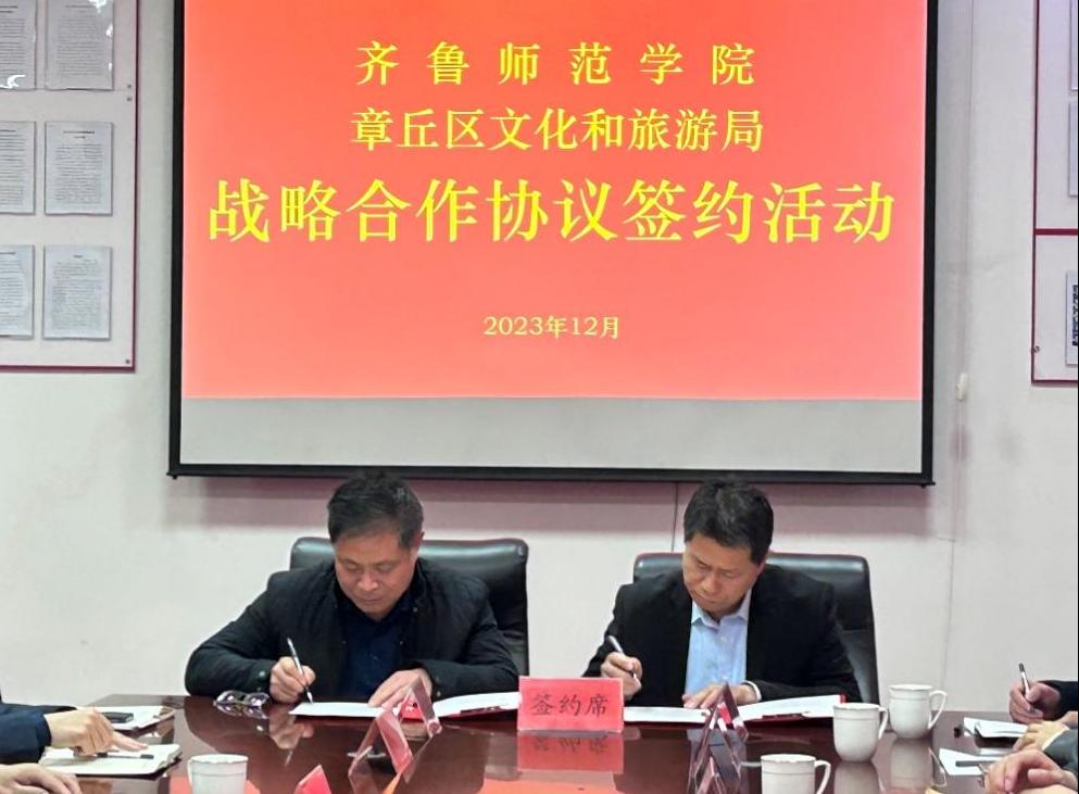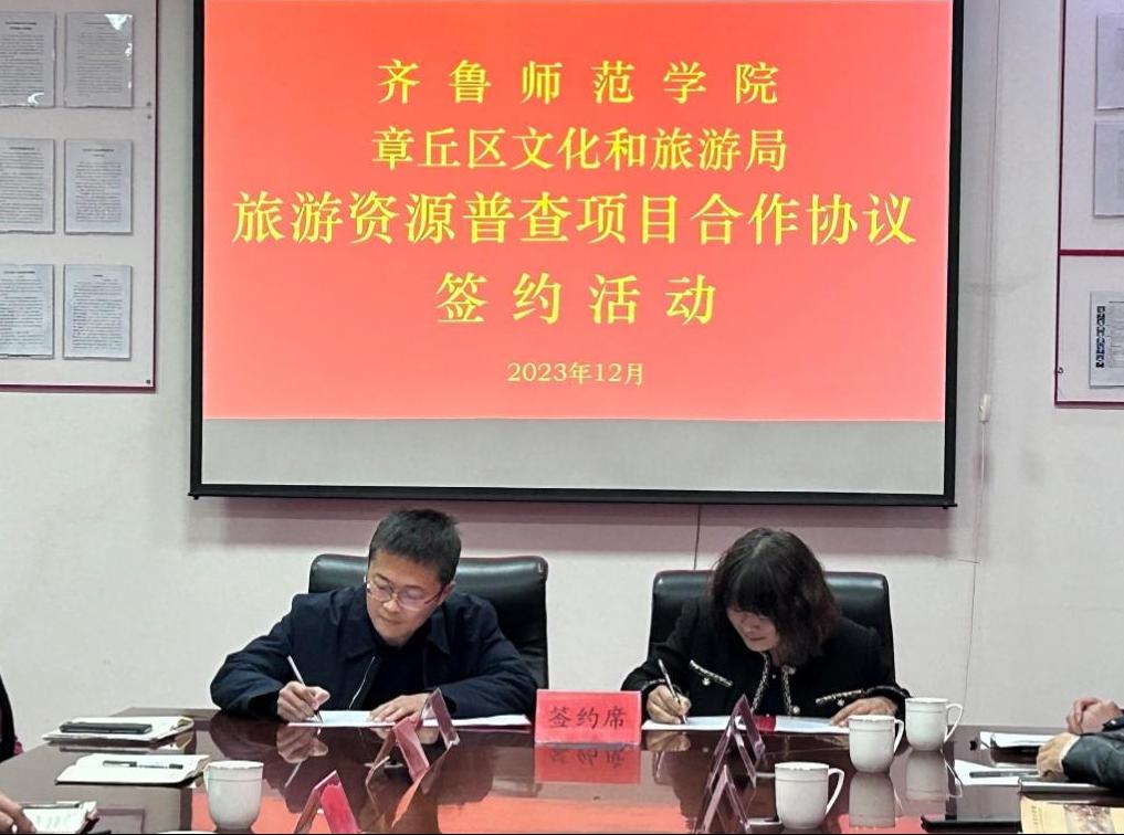 章丘区文化和旅游局党组成员、旅游发展中心主任张霄与地理与旅游学院院长王敏代表双方签署《章丘区旅游资源普查项目合作协议》。