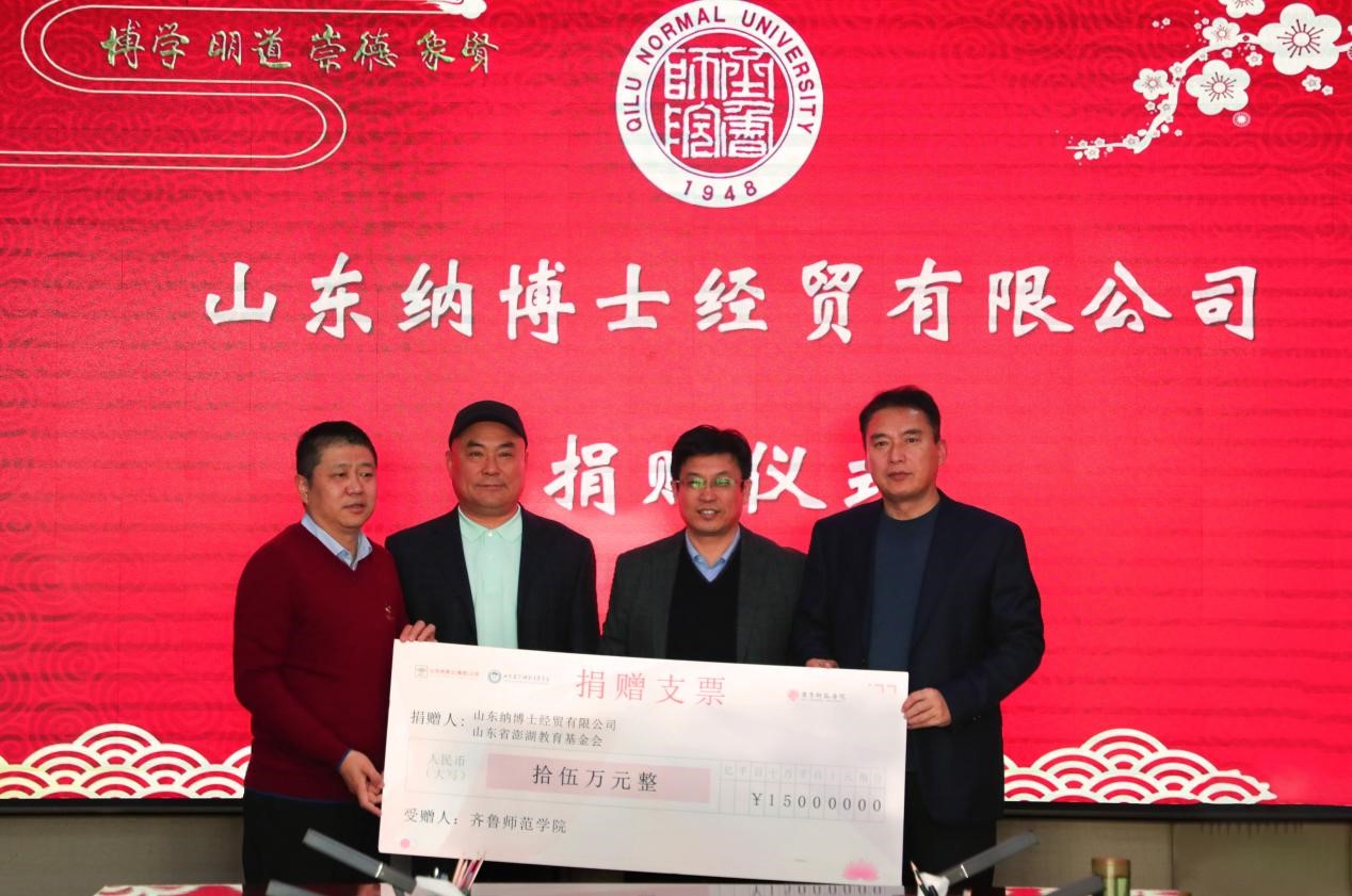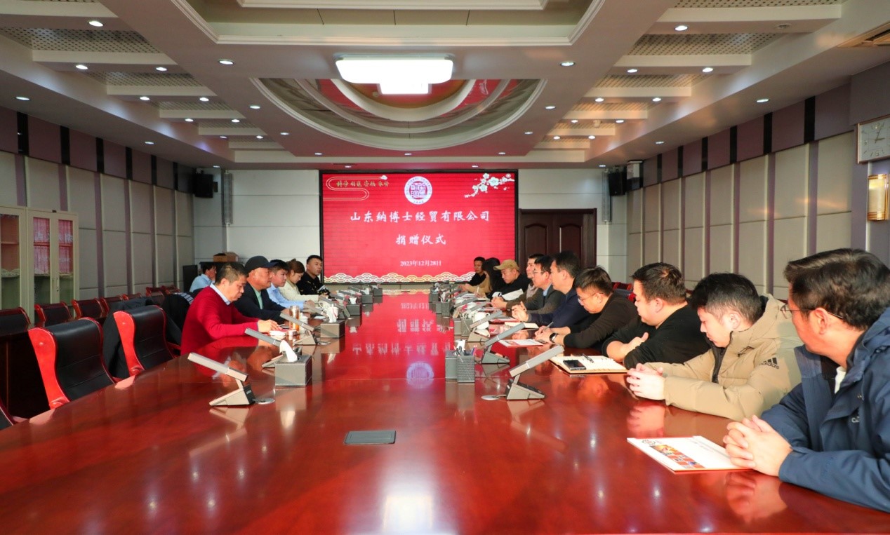 12月28日下午,爱心企业捐赠仪式在学校章丘校区第一会议室举行,山东纳博士经贸有限公司、山东省澎湖教育基金会共同向学校捐赠人民币15万元。校党委委员、副校长李伯伟,山东省澎湖教育基金会理事长任运河,山东纳博士经贸有限公司董事长王汉领出席仪式,后勤管理处全体人员参加活动。