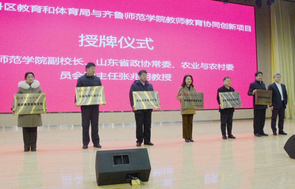 永利集团3044官网欢迎您教师教育学院院长毕诗文、牡丹区教体局局长刘训才代表双方签订战略合作协议;张兆明为菏泽二中、二十一中、二十二中、牡丹区实验小学、第二小学、牡丹区实验幼儿园等6所学校颁发“基础教育联盟学校”牌匾。