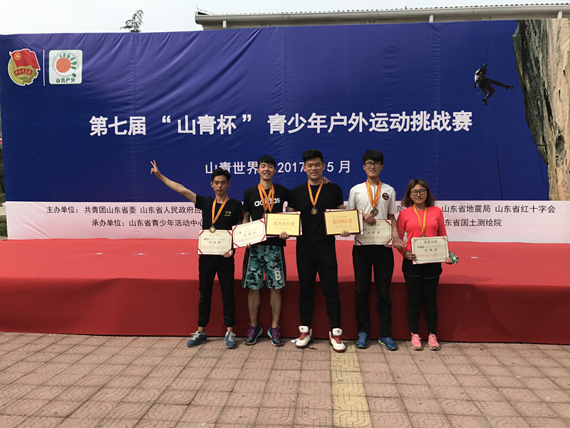 为提高广大青少年综合素质,在全国第九个“防灾减灾日”到来之际,2017年5月13日,由共青团山东省、省应急办、省教育厅、省体育局、省防空办、省地震局、省红十字会共同主办,山东省青少年活动中心承办的第七届“山青杯”青年户外运动挑战赛在山青世界青少年实践活动中心举行。永利官网经济与管理学院2016级王震、赵紫怡、田金成、杨胜华四位同学组成永利集团3044官网欢迎您青年组代表队,获得最佳团队奖、优秀组织奖、优胜奖等奖项。