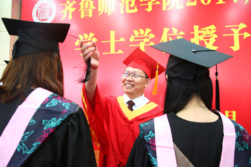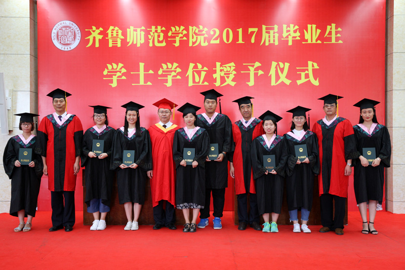 毕业典礼结束后,在图书馆学术报告厅举行了2017届毕业生学士学位授予仪式。学校学位评定委员会主任委员、校长,林松柏教授、副主任委员、副校长刘德增教授、副主任委员、副校长,张福建教授及各学院学位评定分委员会主任委员出席了仪式,并为每位获得学士学位的学生拨穗正冠、颁发证书、合影留念。学位授予仪式在全场师生热情洋溢的掌声中和依依惜别的气氛中圆满结束。 (教务处 邵恒)