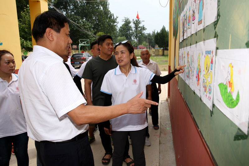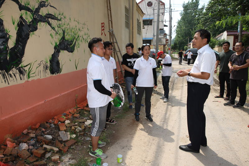下午,张殿臣副书记一行来到了美术学院“薪火传承,永跟党走”社会实践服务队的实践地刘棚行政村刘棚小学。现场观看了队员们“传统文化美育教学”成果画展和 “凝聚青春力量,助力美丽乡村建设”手绘文化墙效果图。前期,队员们通过开设国画、简笔画、书法等特色课程,吸引众多孩子在此学习体验,感受童年生活的美妙,把传承中华传统文化作为美育童心的主要内容。同时,还根据刘棚行政村刘棚小学的设计和要求,绘画小分队分别在2条主干道45块墙体上绘制了近500多平米、40幅宣传画,通过打稿、上色、勾线、整体调整等步骤,用国画、油画、水粉、水彩等表现手法,采用动漫画、诗意画、宣传画、传统画等多种形式,反映出了美好乡村建设的意义、目的和行为准则,主题鲜明,色彩绚丽,形式新颖,图文并茂,既具有观赏性和美化效果,又富有宣传性和教育性,与刘棚小学开学后要开展的“伏羲教育”不谋而合,得到了村民们的一致好评。