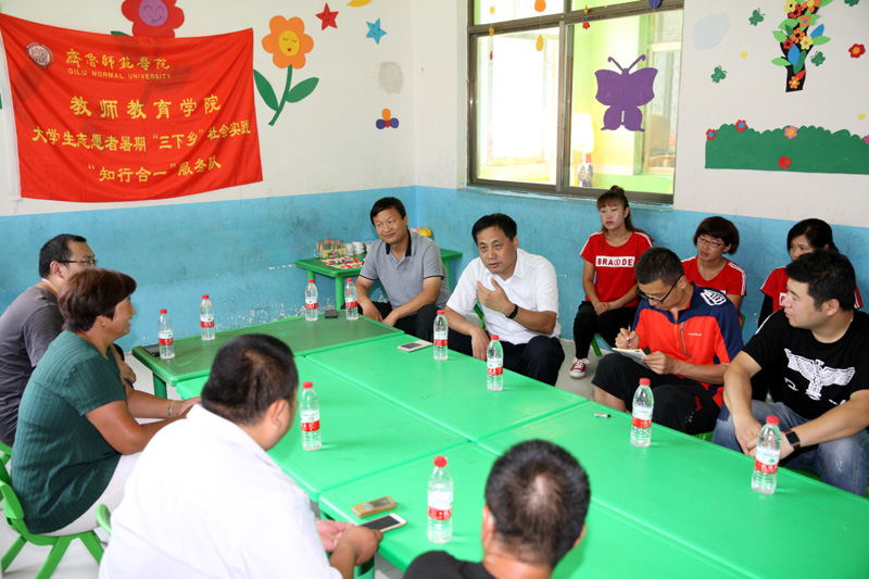 告别刘棚小学,张书记一行来到帅楼行政村,看望教师教育学院“知行合一”社会实践服务队的队员们,现场观摩了幼儿园园区的环境创设成果展示和幼儿园学生的排舞演出。听取了近些天来队员们为幼儿园的留守儿童们,在感受城市、亲情陪伴、基础课程辅导、兴趣特长开发、科普知识教育、心理疏导、爱心捐赠、自护教育等方面提供支教服务的心得体会。张书记与队员们进行了亲切交流,他谈到:“老师对于孩子的影响非常深远,希望你们要珍惜实践锻炼的机会,担负起教书育人的责任,多探索、多钻研,用孩子的话语体系与他们建立良好的沟通,使支教活动真正取得实效,真正做到学以致用,不虚此行,也使你们自己度过一个有意义的假期。”