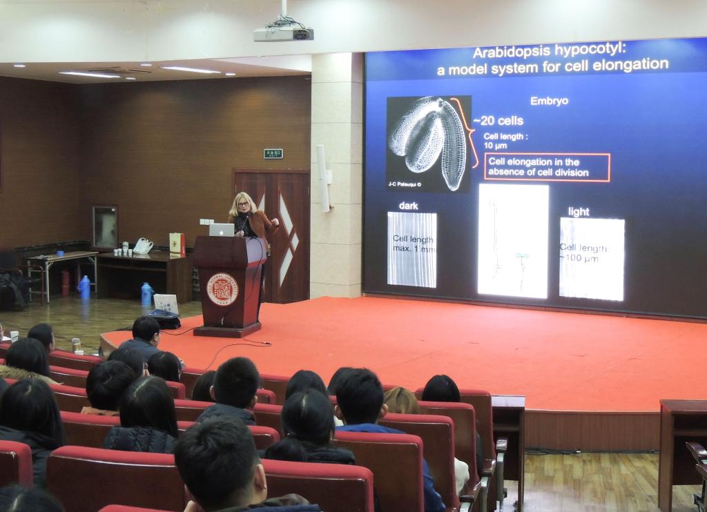 Vernhettes教授访问期间参观了永利官网“能源植物种质创新与改良”重点实验室,并分别与七位老师进行了充分的工作讨论。Vernhettes教授对这些老师的科研工作给予了高度评价和称赞,给出了指导性的建议。Vernhettes教授还在永利官网学术报告厅面向生命科学学院全体师生,作了两场题为《Organization of the cell wall during cell elongation in Arabidopsis thaliana》和《Signal pathways to control cell wall integrity during development and pathogen attack》的学术报告。重点实验室全体人员、生命科学学院学生参加了学术报告会。Vernhettes教授将植物细胞壁研究最前沿的进展和相关技术以通俗易懂的形式向我院广大师生进行了讲解,报告会后,Vernhettes教授和与会师生进行了交流,耐心详细地解答了大家的提问。