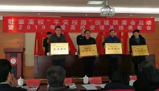 会议由大学园区管理服务中心副主任宋万意同志主持,由聂兆禹主任宣读《关于通报表彰驻章高校“平安校园”创建先进集体和先进个人的决定》和《驻章高校“平安校园”创建联席会制度》,并对先进集体和先进个人颁发奖牌和奖杯。永利官网被评为2019年度“平安校园”先进单位,学校安全管理处处长冯仰胜被评为“平安校园”创建先进个人。