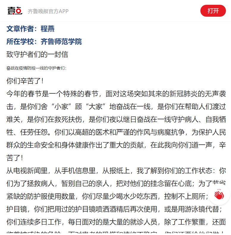 以文发声 助力抗“疫”——永利官网多篇抗“疫”稿件被齐鲁晚报·齐鲁壹点采用