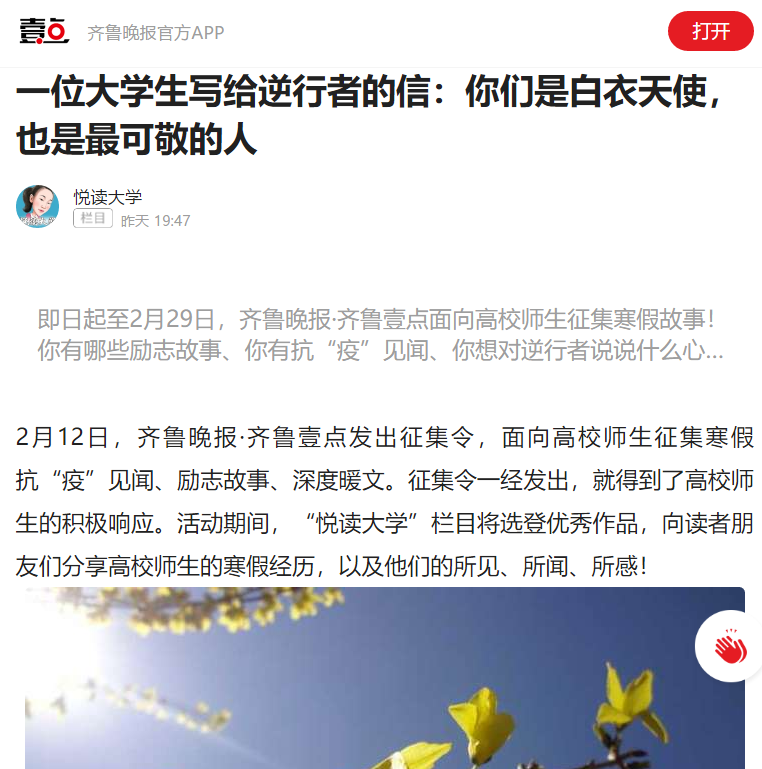 当齐鲁晚报·齐鲁壹点发出征集令,面向高校师生征集寒假抗“疫”见闻、励志故事、深度暖文。征集令一经发出,就得到了永利官网师生的积极响应。齐鲁晚报·齐鲁壹点“悦读大学”栏目采用了永利官网部分优秀作品,现予以转登。