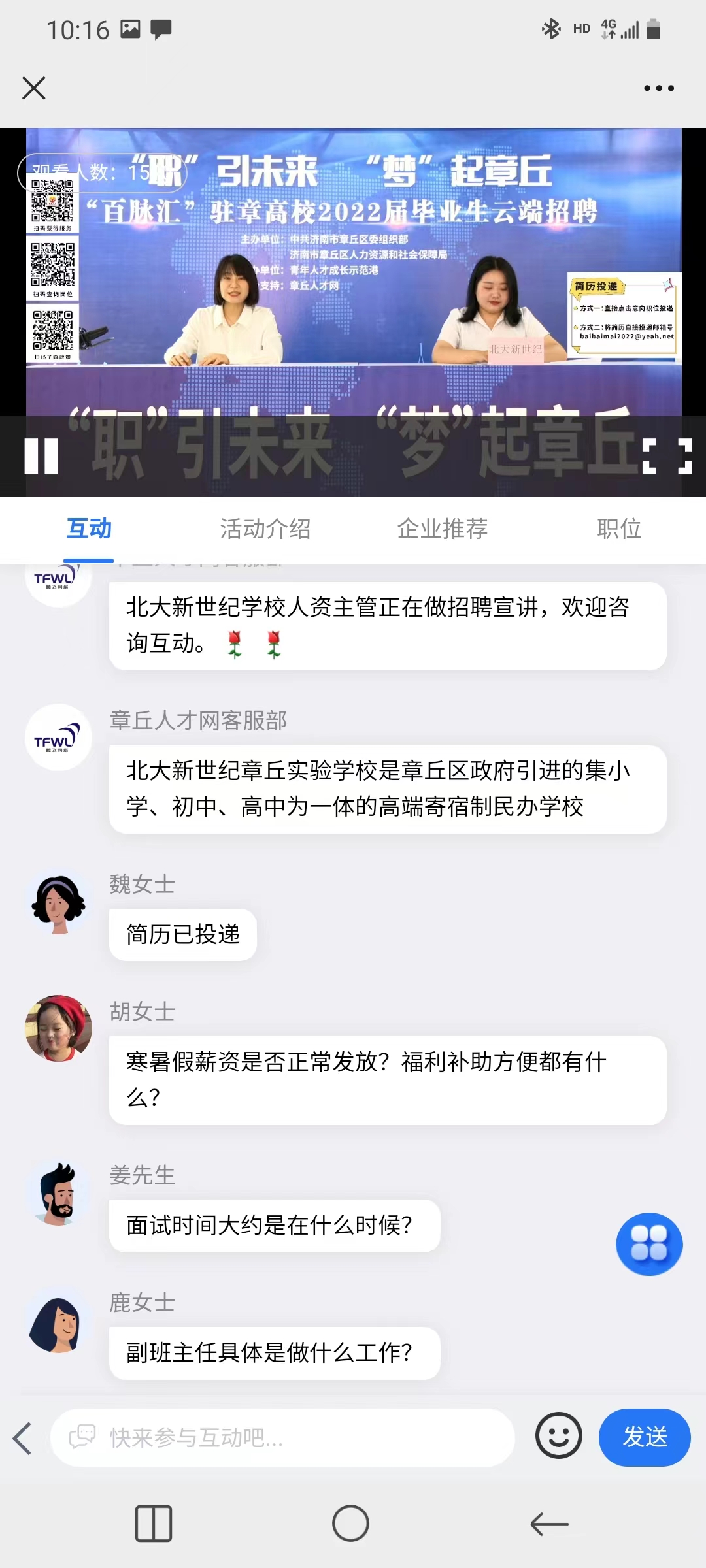在接下来的企业宣讲环节,通过“岗位介绍-线上答疑-直播投递”三位一体式的实时互动,精准实现了用人单位与求职者需求对接。博科生物、华凌电缆、聚合话社、北大新世纪学校4家用人单位负责人空降“青年人才成长示范岗”主会场直播间,进行岗位介绍,上演“抢人大战”。毕业生纷纷上线,就薪资待遇、工作情况、发展空间等关心的问题进行互动交流,现场气氛热烈,在线观看人数2000余人,4000余名毕业生注册并投递简历。