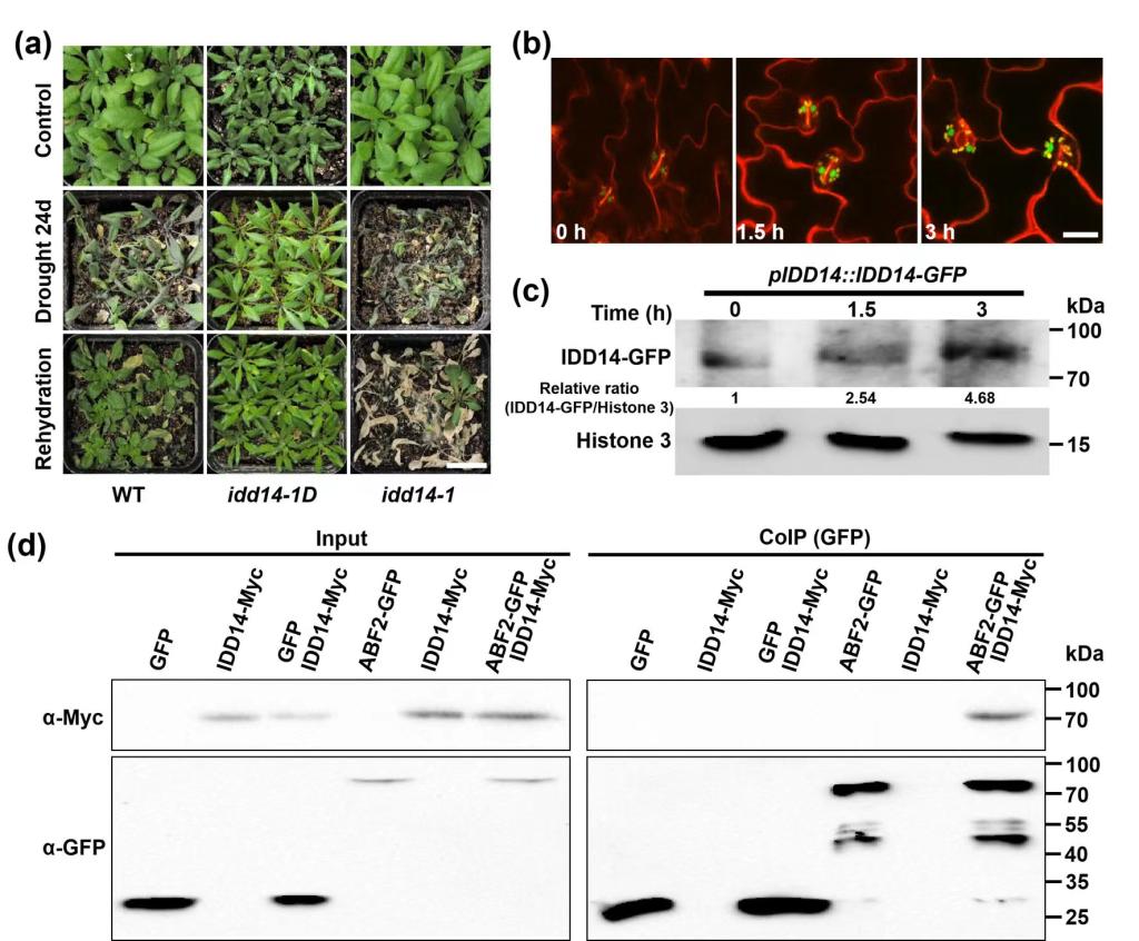 植物学研究团队前期在模式植物拟南芥中研究发现转录因子IDD14与同源家族成员IDD15、IDD16组成一个亚家族,通过调控生长素在植物器官内的分布,影响植物地上器官的生长发育和向重性反应,从而揭示了调控植物生长素空间分布和器官形态建成的一个新机制(PLoS Genetics, 2013)。近期的研究工作表明,IDD14的功能获得性突变体idd14-1D对干旱胁迫的耐受性显著增加,而其功能缺失性突变体idd14-1由于失水速率增高导致对干旱胁迫的耐受性显著下降。研究发现IDD14受ABA和干旱诱导表达,且与ABA信号转导通路关键转录因子ABF1-4均存在蛋白上的相互作用。在idd14-1突变体中失活ABFs增强了idd14-1对干旱胁迫的敏感性,而过表达ABFs可以恢复该突变体对干旱胁迫的耐受性。进一步生化分析表明IDD14通过增强ABFs对逆境响应基因的转录激活能力,从而促进叶的气孔关闭和提高植物的干旱耐受性。