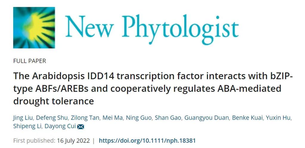 近日,永利官网生命科学学院植物学研究团队,在国际著名学术期刊《New Phytologist》(全球植物科学SCI杂志排名8/238,中科院生物学1区TOP期刊,IF:10.323)上在线发表了题为“The Arabidopsis IDD14 transcription factor interacts with bZIP-type ABFs/AREBs and cooperatively regulates ABA-mediated drought tolerance”的高水平研究论文,发现植物特有转录因子IDDs作为新的脱落酸(ABA)信号转导组分,与ABFs协同调控了干旱胁迫应答反应。