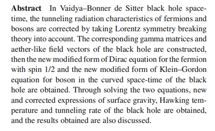 2019年发布了事件视界望远镜拍摄的距离地球5500万光年的M87黑洞的照片,不仅证实了黑洞的存在,更是使黑洞的研究成为国际天体物理学界研究的一个热点课题。黑洞是一个神秘的天体,也是发现新物理的一个敏感领域,已有的研究中,对静态和稳态黑洞有很多的研究报道,但是对动态黑洞的研究报道相对较少,本论文研究了动态黑洞—Vaidya-Bonner de Sitter黑洞。本论文创造性构建了此黑洞对应的伽玛矩阵,考虑洛伦兹破缺理论,研究了此黑洞的费米子和玻色子的隧穿辐射特性,得出了此黑洞的修正的新的表面引力、霍金温度和隧穿率,同时创新性地推出了考虑洛伦兹破缺的空间和质量的相互关系,为揭开黑洞之谜和大统一理论作出了积极贡献。