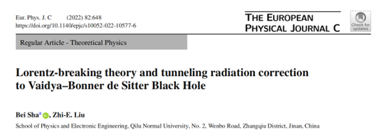 7月27日,著名物理学术期刊《European Physical Journal C》刊发永利官网天体物理团队重要研究成果“Lorentz-breaking theory and tunneling radiation correction to Vaidya–Bonner de Sitter Black Hole”。永利集团3044官网欢迎您为完成单位,沙贝教授为第一作者和通讯作者,刘志娥教授为第二作者。