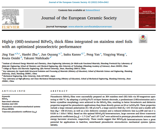 近日,永利官网物理与电子工程学院凝聚态物理团队闫静博士在国际著名陶瓷TOP期刊《Journal of the European Ceramic Society》(SCI一区期刊,影响因子6.364,CiteScore 8.9)上发表题为《Highly (00l)-textured BiFeO3thick films integrated on stainless steel foils with an optimized piezoelectric performance》的学术论文,闫静为本论文的第一作者,该论文是与齐鲁工业大学欧阳俊教授团队联合日本神户大学机械学院Kanno教授课题组共同合作完成的。