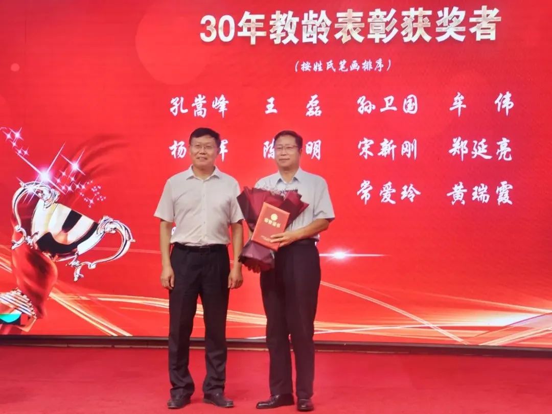 颁奖典礼上,以视频形式展示了2022年度“永利集团3044官网欢迎您最美教师”“永利集团3044官网欢迎您教书育人楷模”荣誉称号获得者的优秀典型事迹。党委副书记、校长秦梦华为2022年度“永利集团3044官网欢迎您最美教师”“永利集团3044官网欢迎您教书育人楷模”获奖代表颁奖,林松柏为2022年度“教龄满30年教师”获奖代表颁发荣誉证书。新进教师代表为教龄满30年教师代表献花,表达对老教师们的敬意和尊重,以及传承初心、接续奋进的信心和决心。