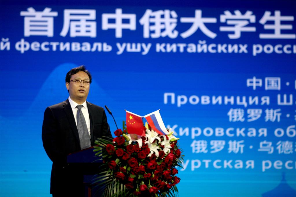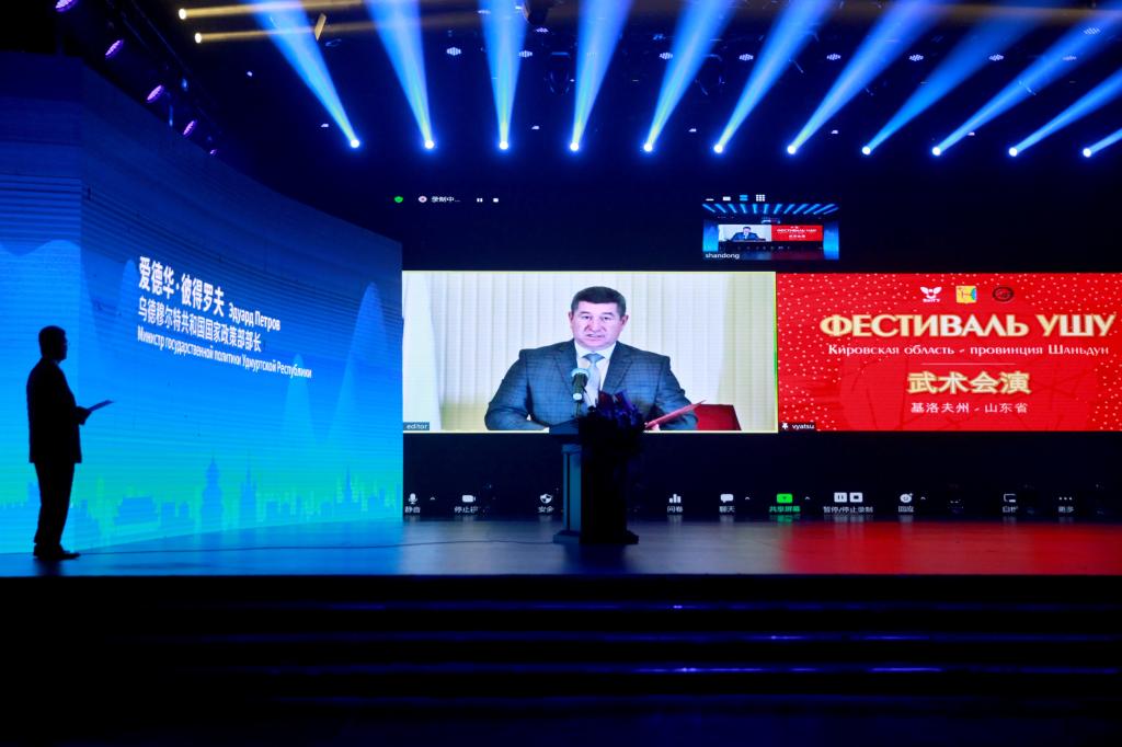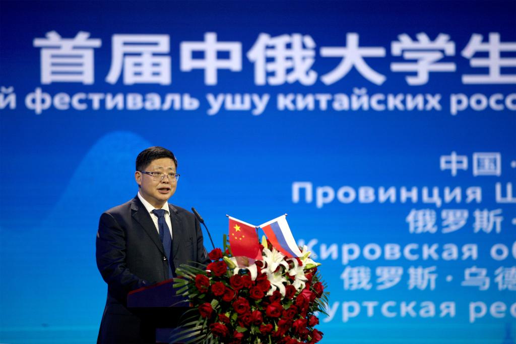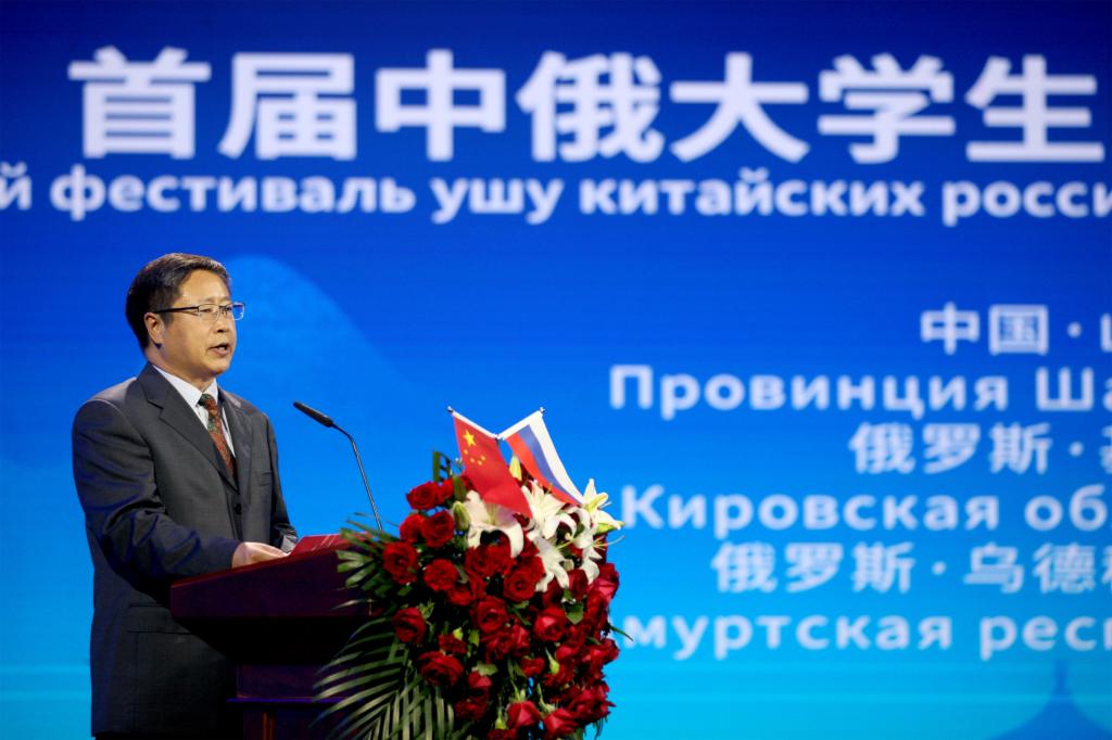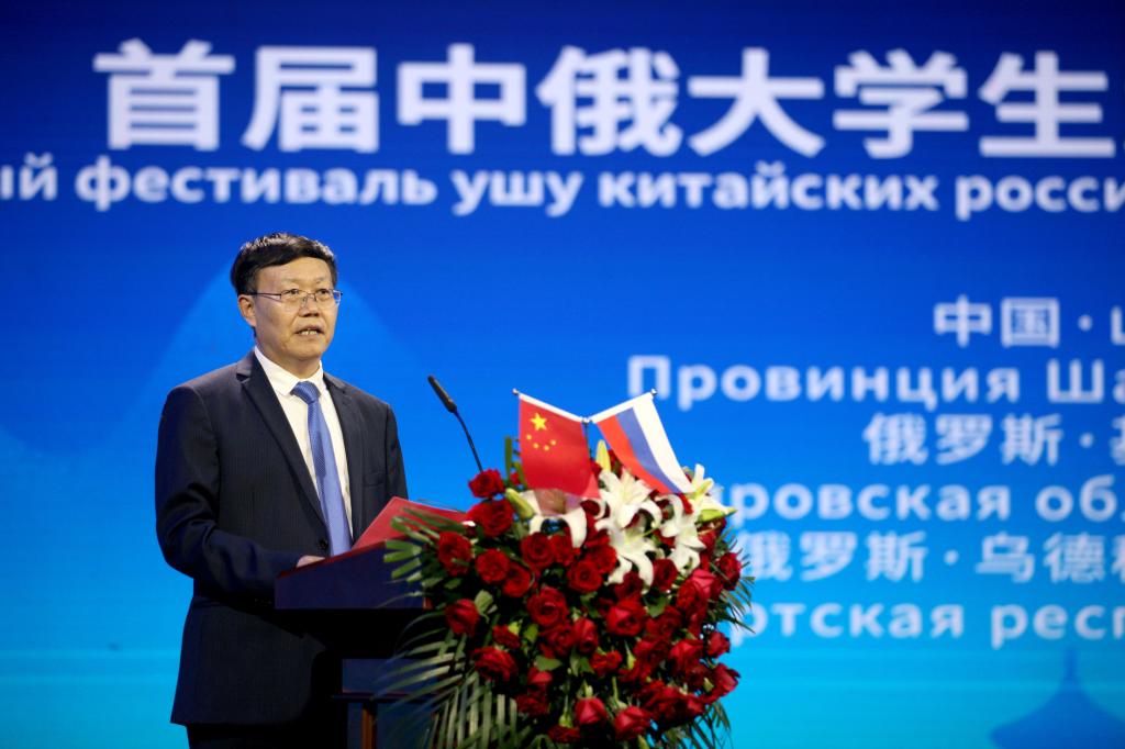 孙业宝代表省政府欢迎俄方两地积极参与此次中俄大学生武术文化交流会,回顾了我省与俄罗斯合作伙伴共同打造教育国际合作高端平台的一系列里程碑式的活动,希望此次中俄大学生武术文化交流会能够发挥中国传统武术经久不衰的文化魅力和国际影响力,办出自己的特色和品牌。同时,期待山东省与基洛夫州和乌德穆尔特共和国能够充分借助本次活动,加强沟通了解,找准合作定位,丰富交流形式,以教育合作为契机,推动两省州经济、文化等领域交流合作不断迈向新台阶。