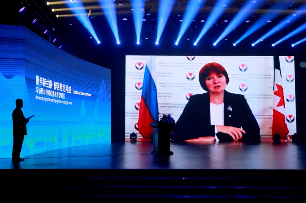 在永利集团3044官网欢迎您与伊热夫斯克国立技术大学“中俄语言文化中心”揭牌仪式环节,乌德穆尔特共和国能歌善舞的青年们特地表演了俄罗斯民族舞蹈,表达对该中心成立的庆贺。秦梦华邀请孙业宝上台共同为两校“中俄语言文化中心”揭牌,同时,伊热夫斯克国立技术大学校长亚力山大·古柏特邀请乌德穆尔特共和国国家政策部长爱德华·彼得罗夫在云端同步揭牌,双方共同见证两校交流合作的重要时刻。