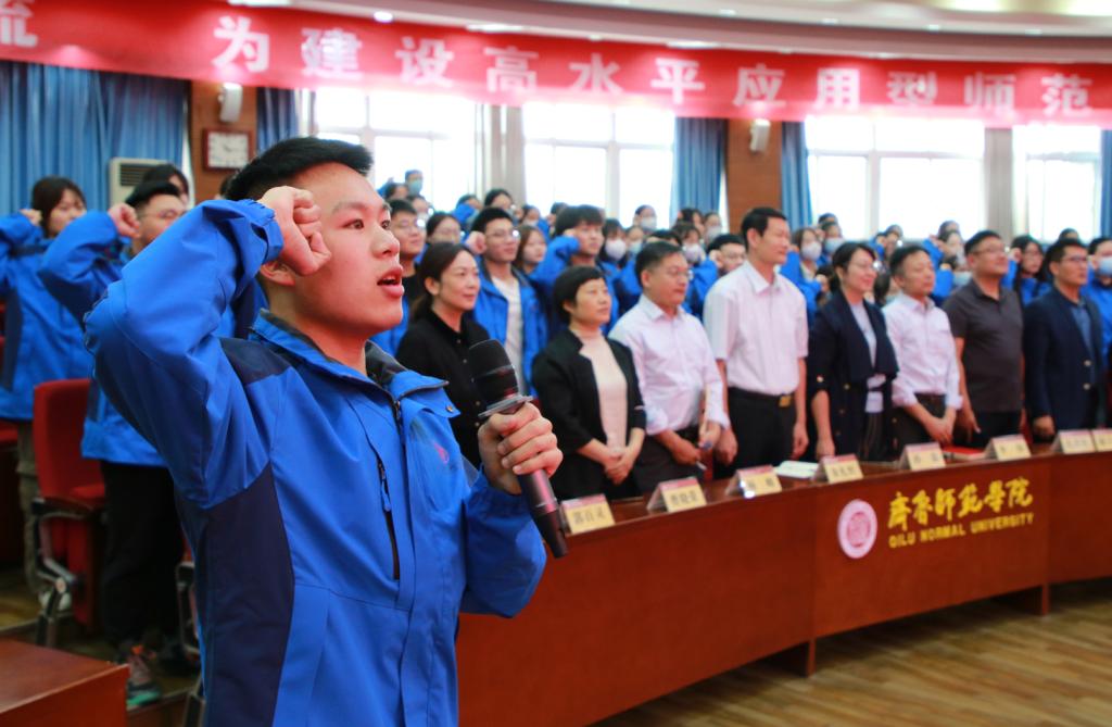 外国语学院张宗老师代表支教团带队教师发言,表示全体支教团教师会时刻谨记校训“博学明道,崇德象贤“的校训,续写援疆支教光荣篇章。外国语学院学生秦夏楠代表全体支教团学生发言中表态,将牢记支教团所肩负的责任和使命,加强政治意识,提高政治站位,端正支教态度,严格遵守纪律,圆满完成实习支教任务。文学院退役大学生士兵姚海龙带领支教团师生进行集体宣誓。