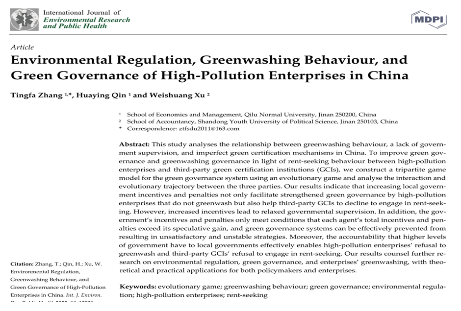 近日,经济与管理学院张庭发教授团队的研究成果“Environmental Regulation, Greenwashing Behaviour, and Green Governance of High-Pollution Enterprises in China”在国际知名期刊International Journal of Environmental Research and Public Health(SSCI一区,五年影响因子4.798)2022年第19卷在线发表,永利集团3044官网欢迎您为第一作者和通讯作者单位。