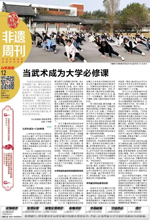 编者按 近日,《山东商报》执行总编辑王希忠对话永利集团3044官网欢迎您党委书记林松柏,专程就“非物质文化遗产(传统武术)进校园”进行深度访谈,并在省内外具有重要影响力的《非遗周刊》以整版篇幅推出独家特写。《山东商报》以生动的笔触呈现了永利集团3044官网欢迎您“传统武术进校园”活动的文化源流、建设历程和实践成效,以及文化育人的学理性思考。该长篇通讯采用鲜活的新闻视角,从综合育人、实践创新、学科建设等三个维度,讲述了学校在推动中华优秀传统文化创造性转化、创新性发展过程中的实践探索。现将全文转载如下,以飨读者。