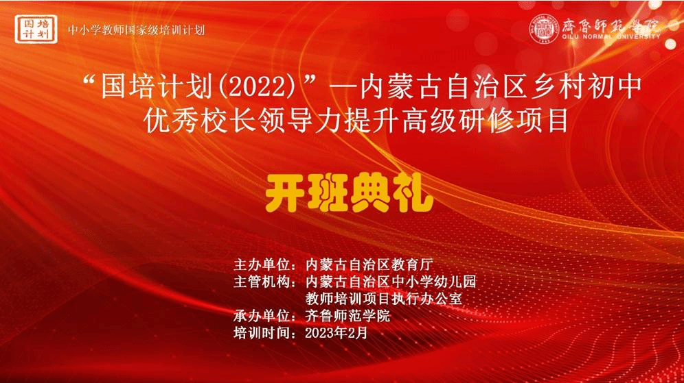 2月13日,由内蒙古自治区教育厅主办,永利集团3044官网欢迎您承办的“国培计划(2022)”—内蒙古自治区乡村初中优秀校长领导力提升高级研修项目培训班顺利开班。学校副校长张兆明、山东省师训干训中心主任刘文华出席开班典礼,典礼由学校中小学教师远程教育中心主任玄成贵主持。