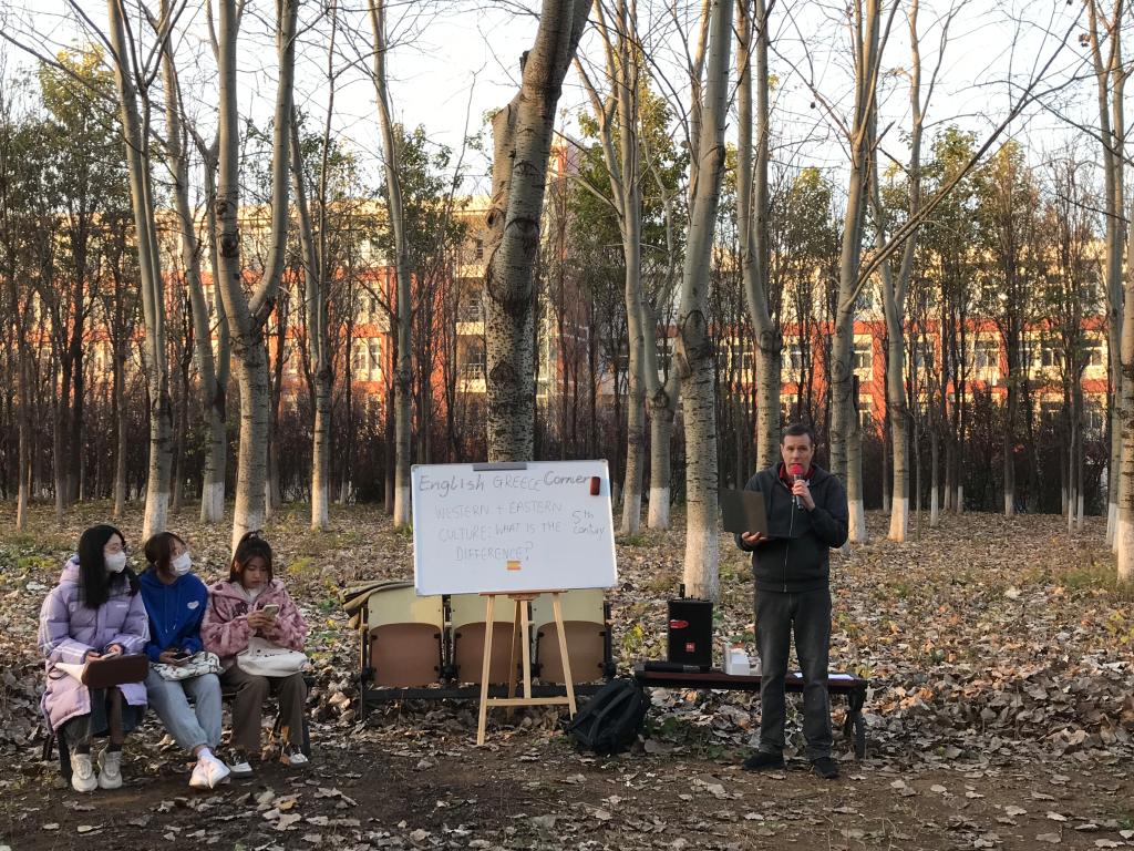 11月15日下午,永利官网校园英语角在图书馆西侧路北杨树林正式设立,并开展活动。首次活动由永利官网澳大利亚籍教师、奥克兰理工大学语言研究硕士Toby Games主持,国际交流与合作处,外国语学院教师、学生,各学院英语爱好者踊跃参加。