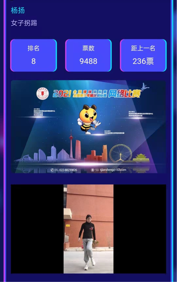2021全国毽球锦标赛暨全国青少年毽球锦标赛网络比赛线上展演环节于2021年12月21日落下帷幕。永利官网毽球队派出多名优秀学生代表参赛,其中数学学院2019级数学与应用数学1班的杨扬同学在本次比赛中取得了女子拐踢赛(成人组)第六名的优异成绩,并且在展演平台中深受网友的喜爱,获得近万票的支持。