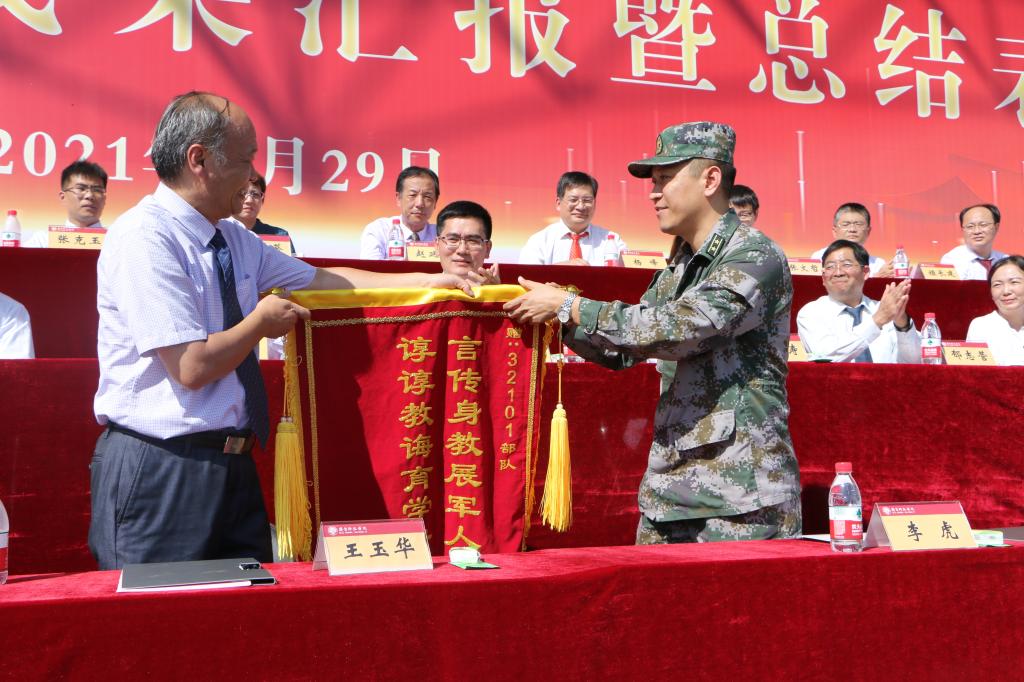 王玉华代表学校向承训部队的辛勤付出表示感谢并赠送锦旗。在总结讲话中他充分肯定了2021级新生军训工作取得的显著成效,向圆满完成各项训练任务的全体官兵和广大师生表示祝贺。他指出,大学生军训是学校实现“立德树人”根本任务的重要途径,学校始终坚持将军训作为新生入学教育的第一课,把国防教育渗透到人才培养全过程。新时代吹响了学校高质量发展的新号角,师院人正以时不待我、只争朝夕的精神,接续奋斗、砥砺前行。