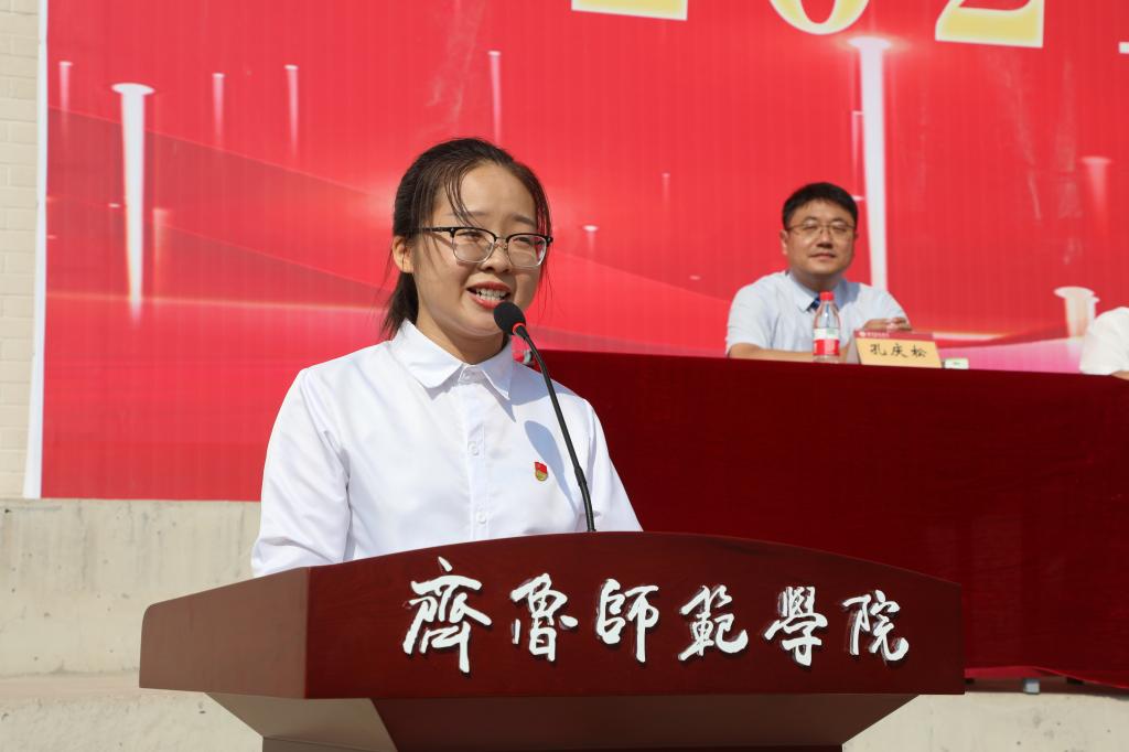 在校生代表、文学院2018级林洁同学代表所有学长学姐们欢迎2021级学弟学妹们的到来,她分享了自己在师院学习、生活的感悟,并勉励学弟学妹们要学做人,立德修身,常思常问,做有德、有智、有品的人;学做事,勤勉踏实,目标明确,立足当下,在实践中一步一个脚印地踏踏实实地学习,用奋斗精神铸就青春底色。