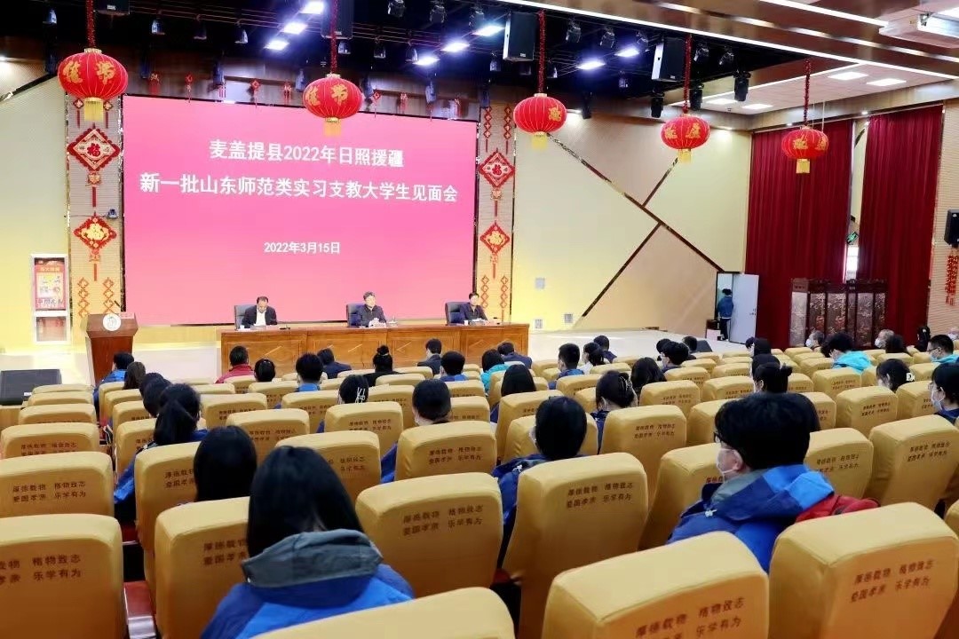 3月15日上午,麦盖提县2022年日照援疆新一批山东师范类实习支教大学生见面会于麦盖提县第四中学学术报告厅隆重召开,永利集团3044官网欢迎您援疆实习支教团全体师生参加会议,此次会议也标志着永利官网选派的59名实习支教大学生肩负使命,正式走上工作岗位。麦盖提县委副书记、日照援疆指挥部党委书记、指挥谢霁晓出席并讲话,县委常委、组织部部长杨青仓致欢迎辞并介绍了麦盖提县的基本情况和教育发展情况,县政协党组成员、教育局局长玉苏甫•买合苏提主持。