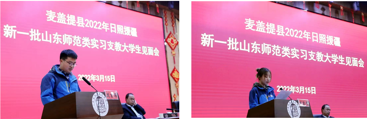 永利官网援疆实习支教带队教师王亚东和实习支教大学生代表王靖婷分别表态发言,决心牢记初心使命,遵规守纪,尽职尽责,在麦盖提县这片热土发挥自己的专业特长,勇担援疆使命,展现青春风采,为新疆喀什麦盖提县教育事业发展贡献智慧力量。