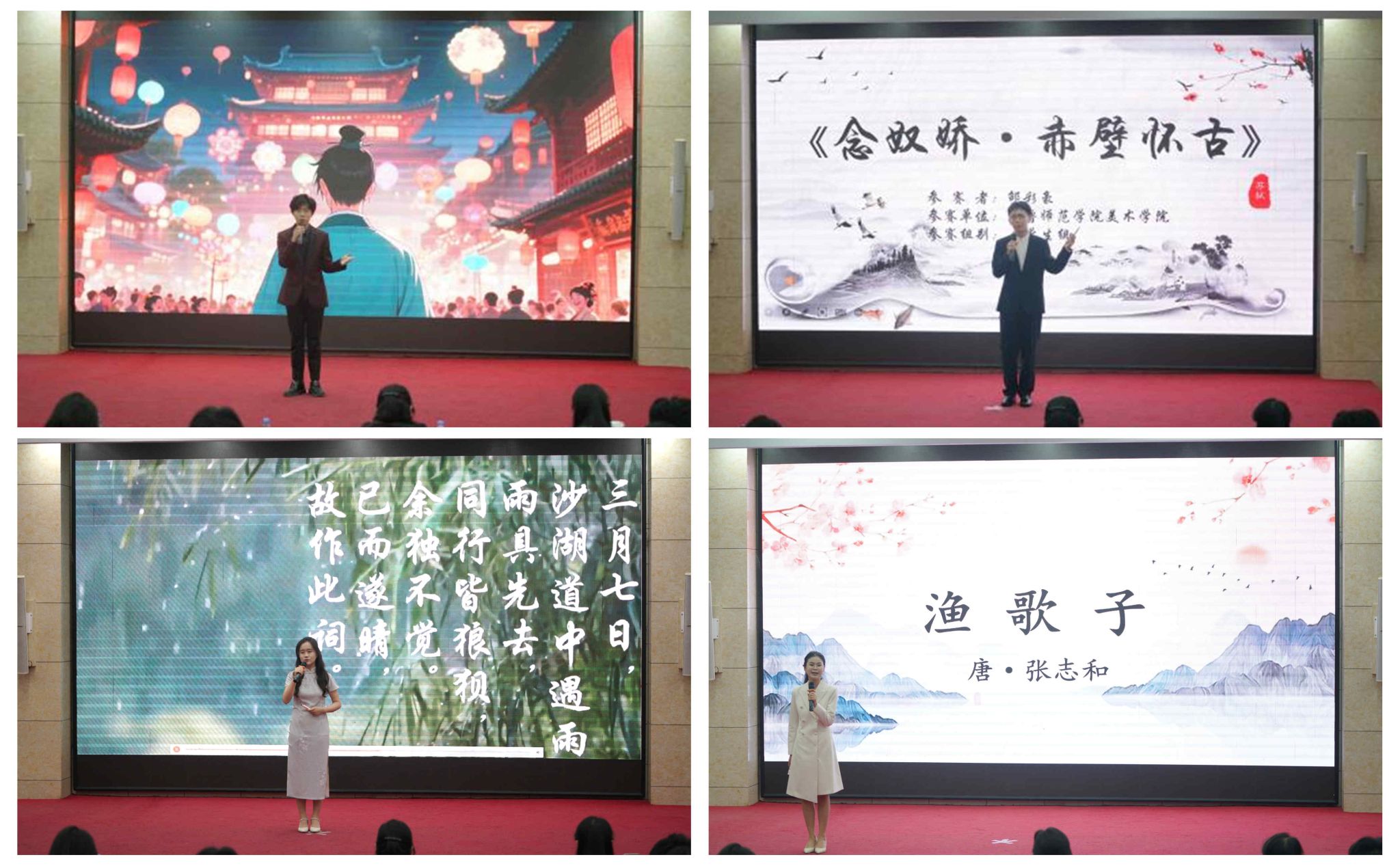 12名参赛选手齐聚一堂,共品诗词之美,同传经典之韵。有的选手围绕《望岳》展开,从杜甫青年时期壮志豪情的时代背景切入,剖析诗人雄伟磅礴的描绘;有的选手聚焦《定风波·莫听穿林打叶声》《念奴娇·赤壁怀古》,提炼出优美的诗词意境;还有的选手在现场吟唱《青玉案·元夕》,歌声婉转悠扬,细腻诠释出辛弃疾笔下含蓄深沉的情思……参赛选手们精心挑选经典诗词,讲解层层递进。他们在深情吟咏中与古人对话,在深度挖掘中与时代共鸣,慷慨激昂,引人入胜。