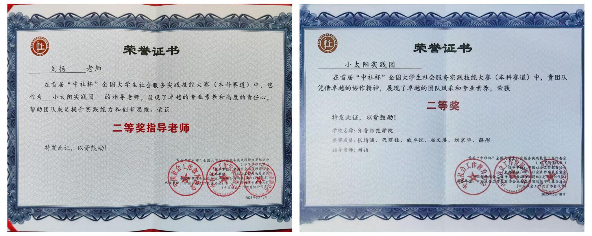 近日,首届“中社杯”全国大学生社会服务实践技能大赛决赛在北京圆满收官。本次大赛由中国社会工作教育协会指导,中社社会工作发展基金会等权威机构联合主办,吸引全国263所高校的763支队伍同场竞技。经过激烈角逐,永利官网社会工作专业学生张靖涵、薛彤、刘京华、赵文琪、代丽佳,以及小学教育专业戚卓悦组成的“小太阳实践团”,在本科赛道脱颖而出,以第13名的佳绩荣获全国二等奖,彰显了师院学子的卓越风采与专业实力!