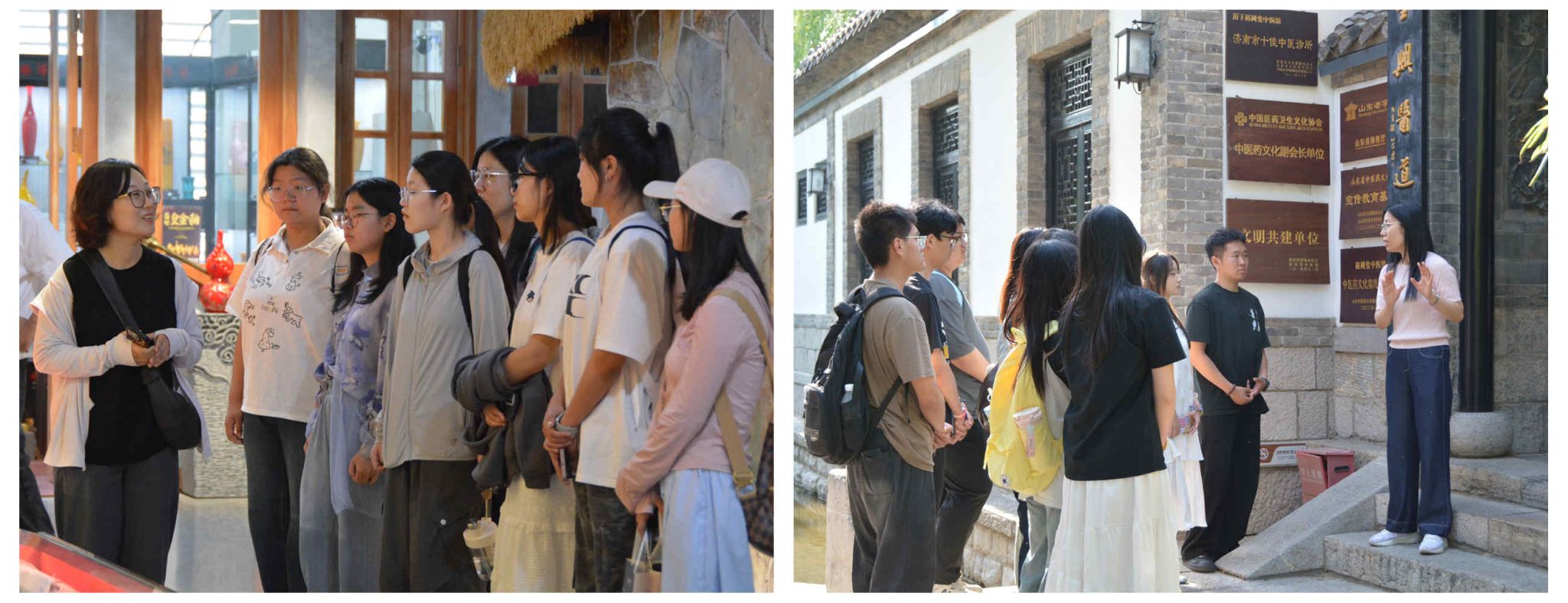 最后,师生们来到百花洲历史文化街区开展历史文化名城保护和开发利用专题调研。作为老济南风貌的核心区域,百花洲历史文化街区汇聚了众多古建筑与非遗资源,展现了老济南传统文化风貌。带队教师带领同学们走访百花洲历史文化街区的古迹遗址、传统街巷,观察建筑风貌与空间格局,系统梳理了其历史发展脉络及在济南城市发展中的重要价值。